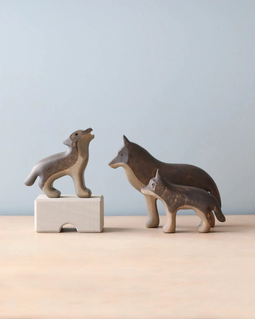 Handmade from alder wood and coated with organic linseed oil and painted with non-toxic, water based paint. This set includes a mama wolf and two babies.Â