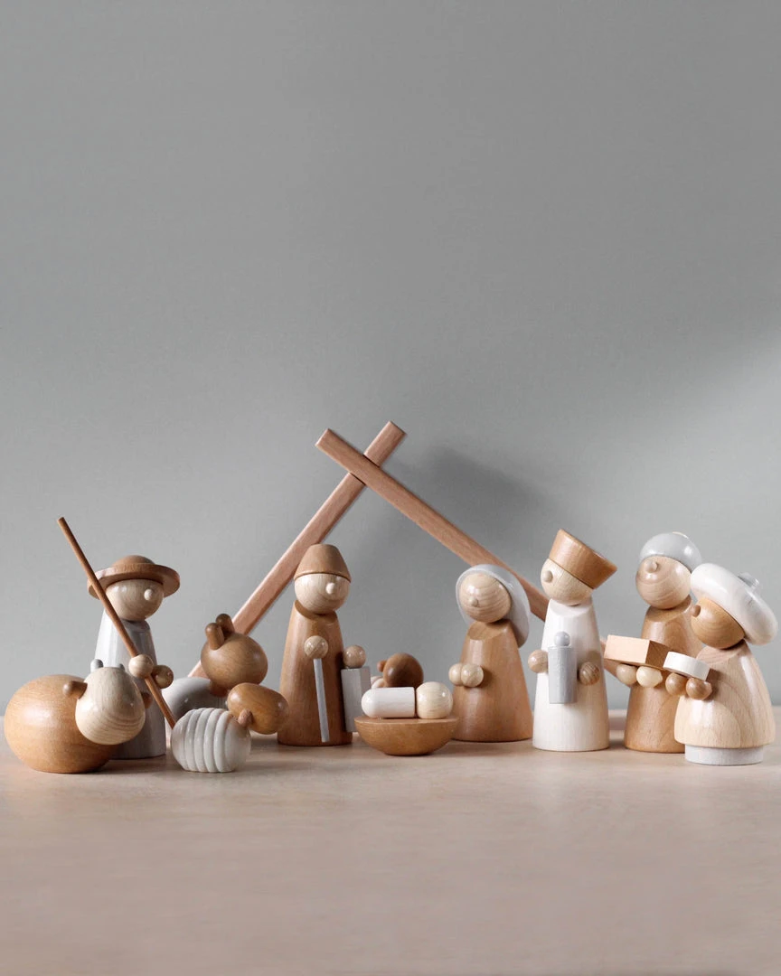 Made in Germany, this nativity set features 1 manger, 1 Mary figure, 1 Joseph figure, 1 nativity scene with baby Jesus, 3 kings, 1 shepherd, 2 sheep, 1 donkey, and 1 ox. The faces and bodies have been made both minimalist and expressive at the same time. Little ones can familiarize themselves with the Christmas story and reenact it in their own way. The colors have been deliberately toned down to give the figures a contemporary yet timeless appearance. Material: beech.