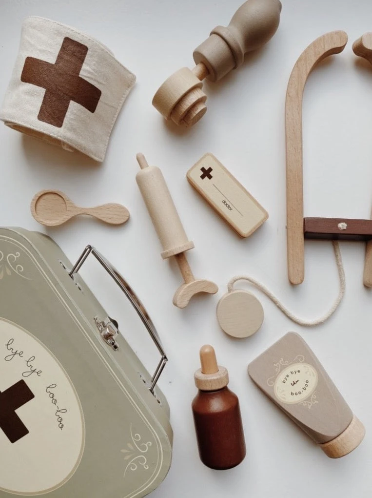Contains: balm tube of boo-boo cream, a stethoscope, a syringe, medicine drops, a spoon, an otoscope, a bandage a doctor’s name tag with magnets and a suitcase