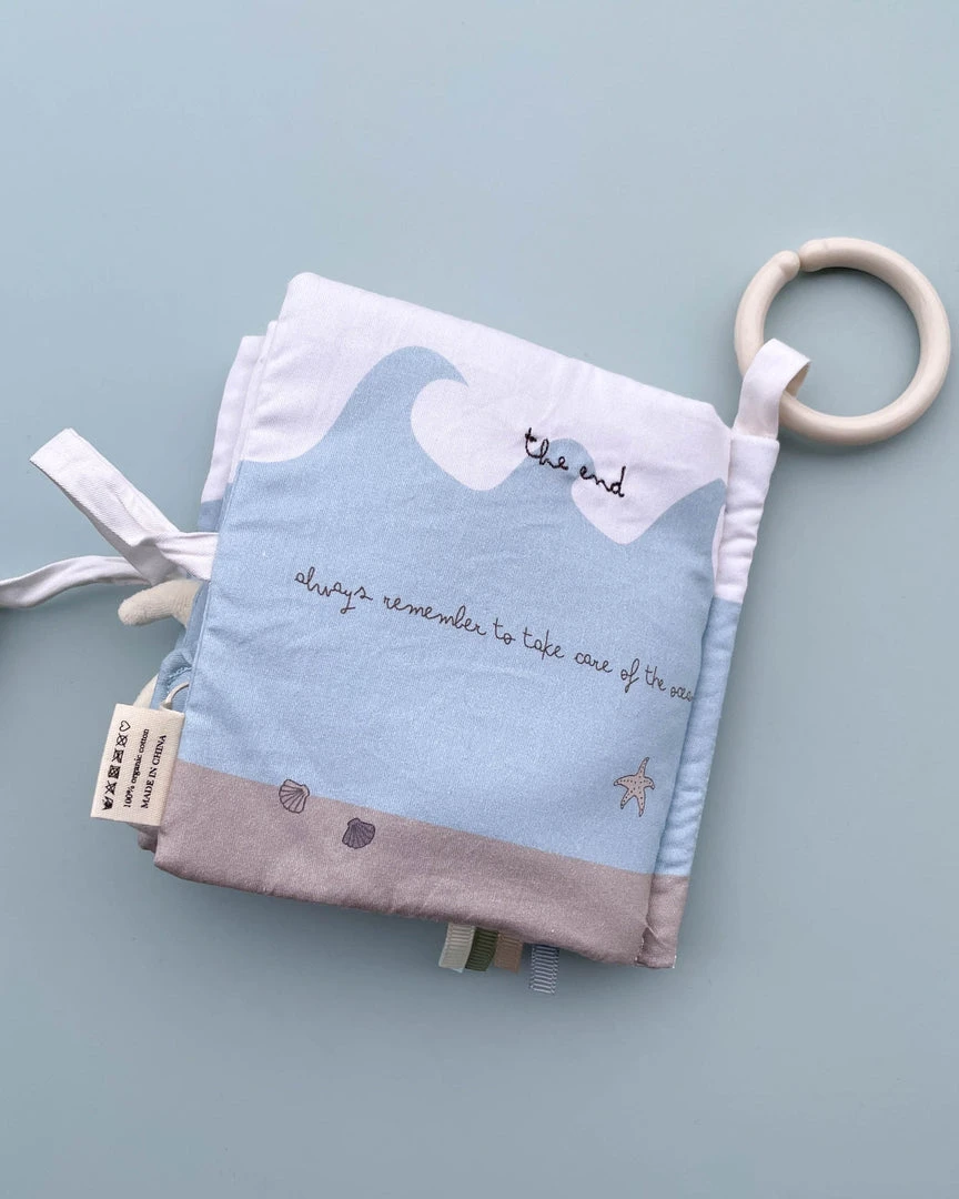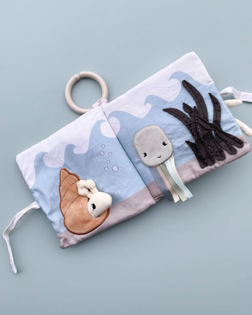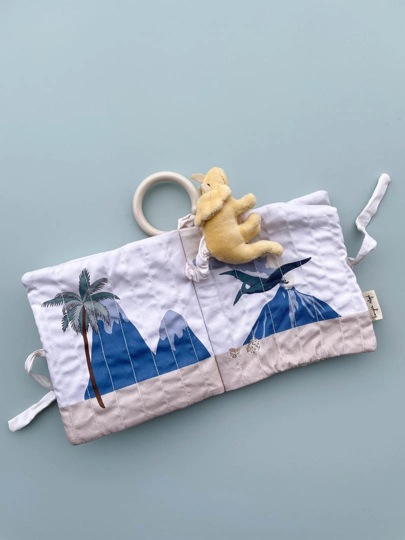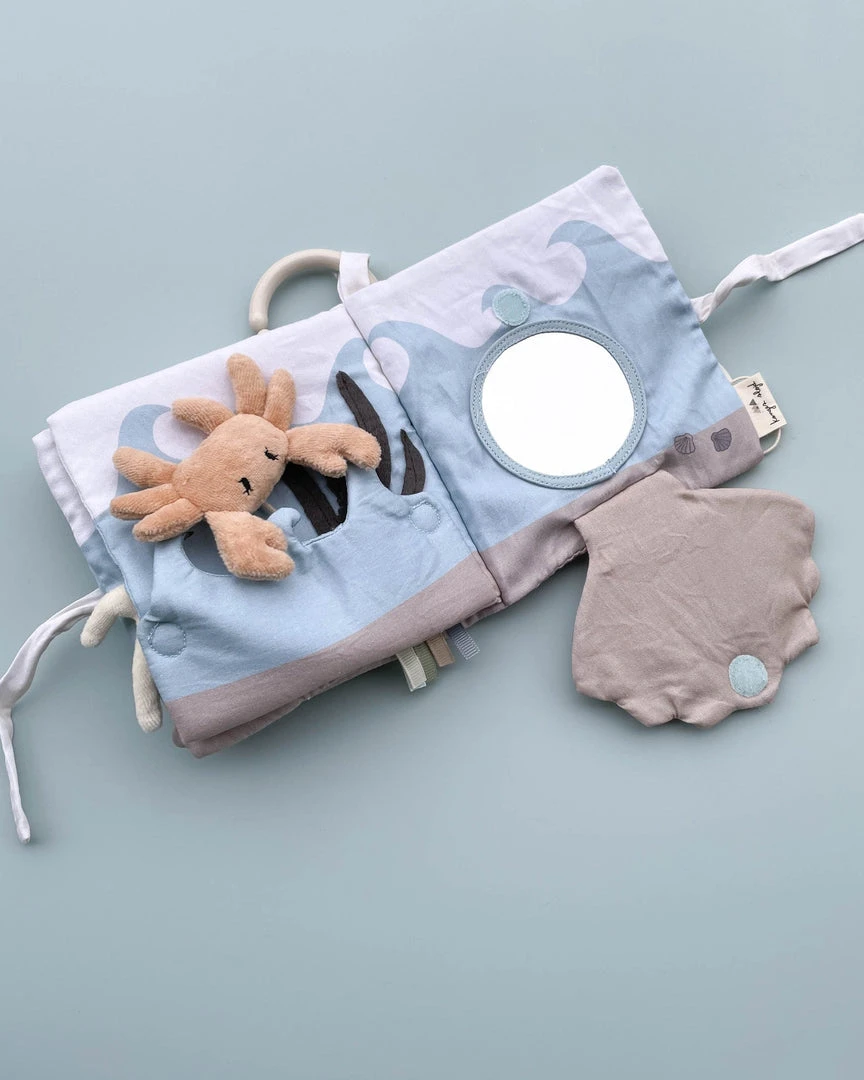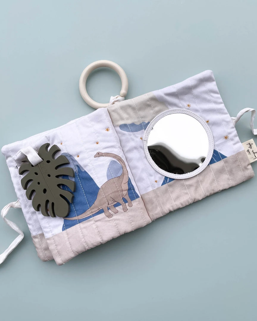 This cute fabric book can be attached to a stroller or used independently as an activity toy for your baby. Inside the fabric book your little one will discover lots of interesting finds.