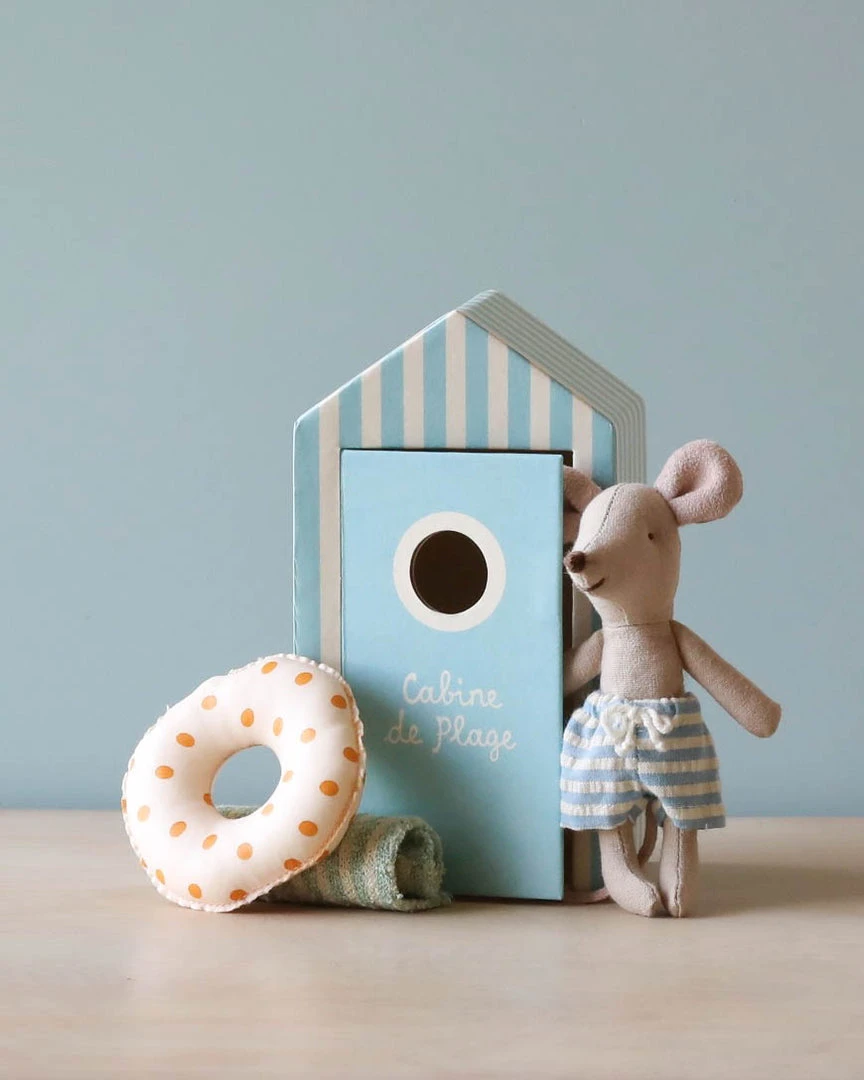 Vacation time. These mice are ready for a day at the beach, with all needed accessories and a beautiful striped beach house.