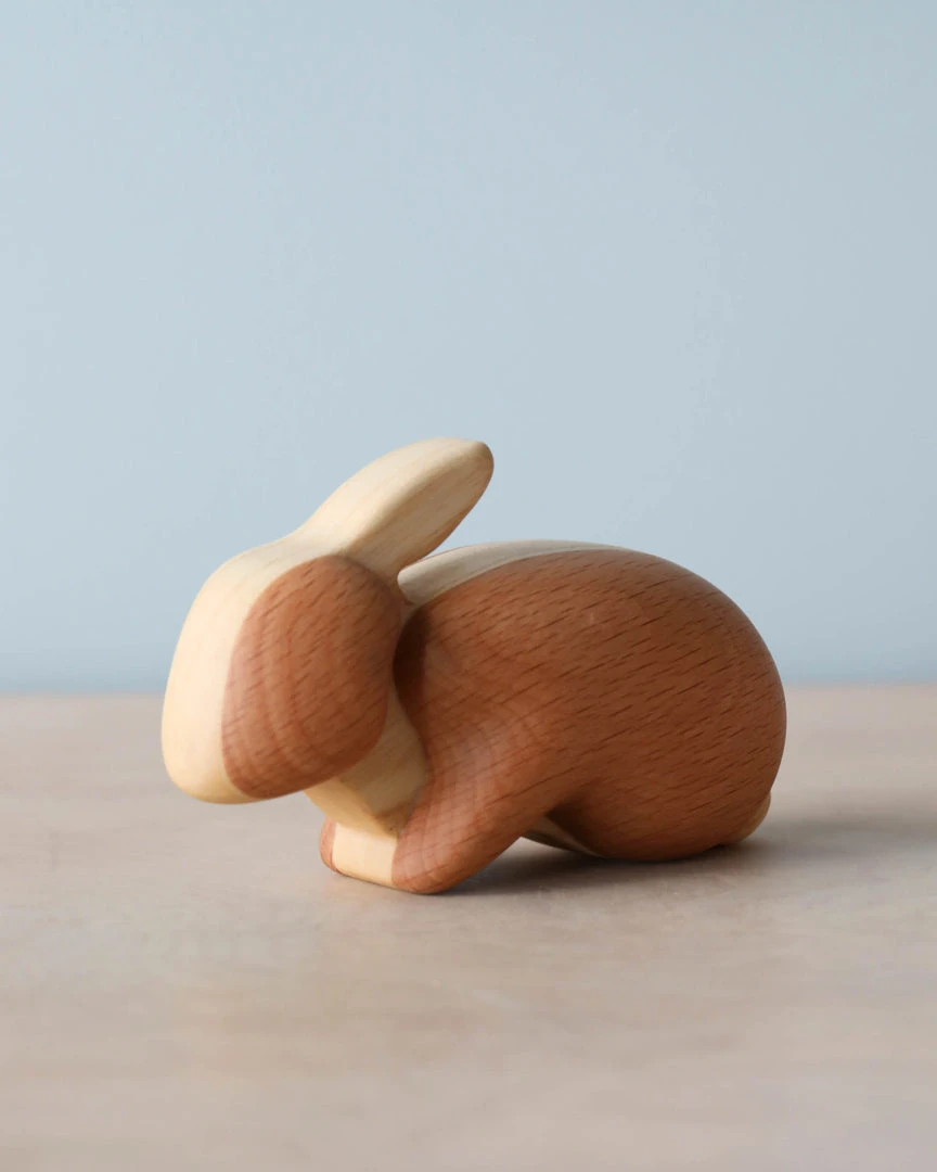 Inspired by minimal Scandinavian design, this bunny is crafted from sustainably harvested hardwood (ash and beech wood) and coated with a mixture of organic olive oil and beeswax. Each piece is carefully sanded for a silky smooth finish.