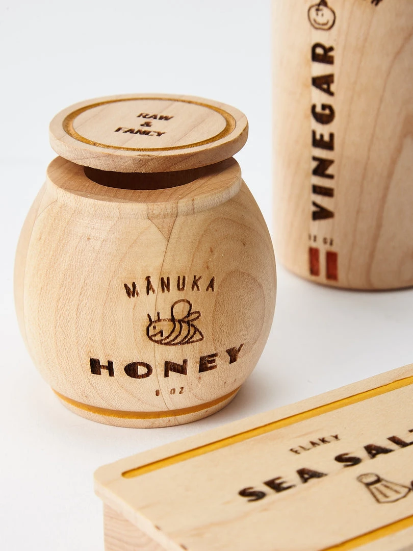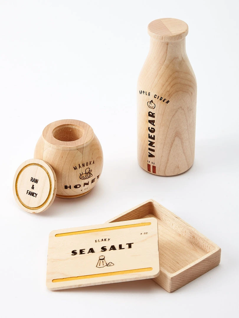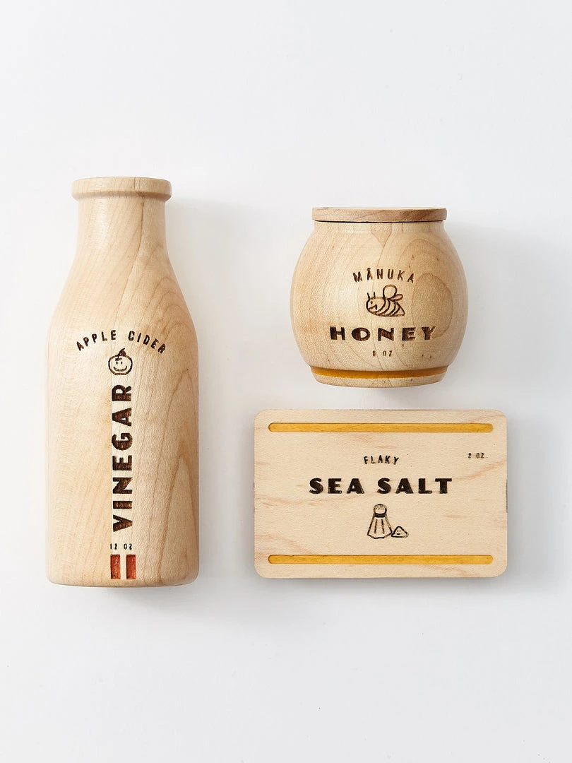 A modern take on the pantry essentials every little chef should have in their arsenal. Jar and box open for expanded play. Each set includes Apple Cider Vinegar, Manuka Honey, and Flaky Sea Salt and comes in a beautiful cotton drawstring bag.Â