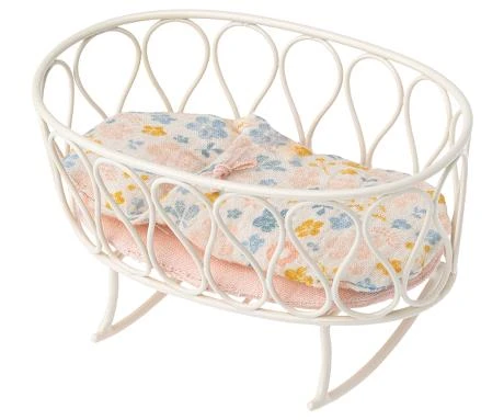 A beautifull designed cradle with a soft sleeping bag inside. The cradle is made of metal and you can easily rock your tiny soft toy into sleep.