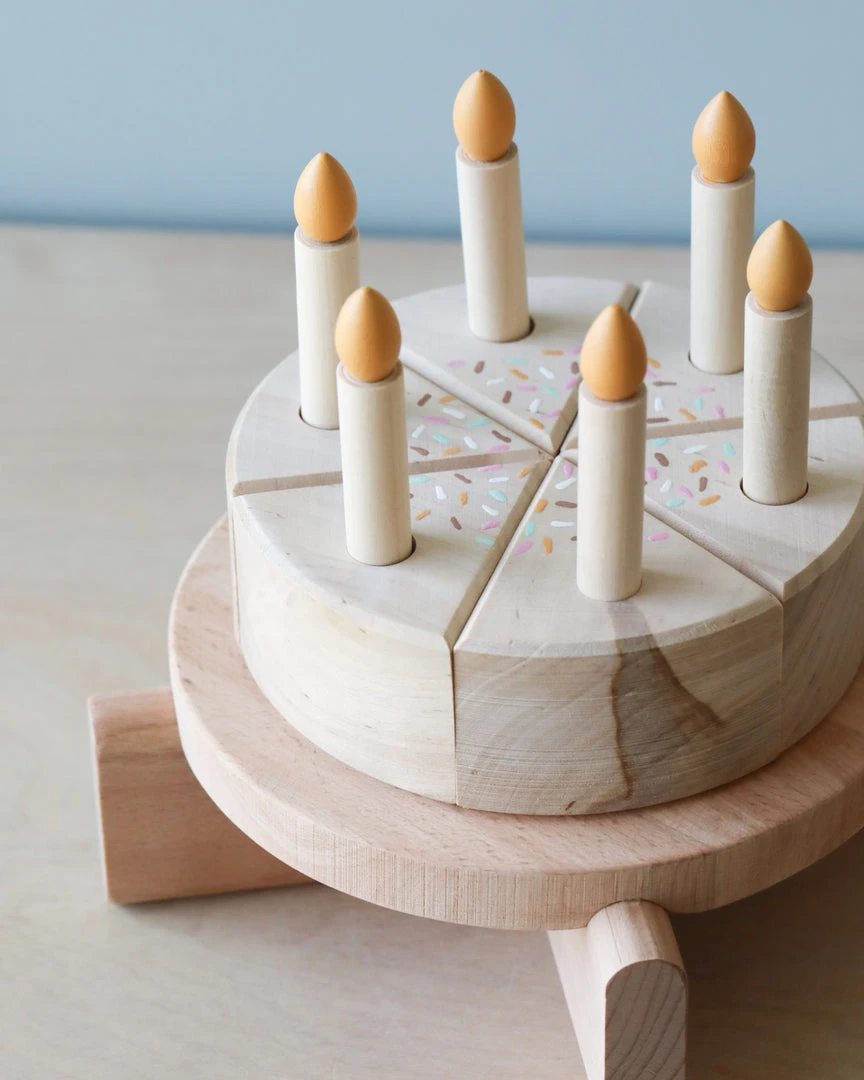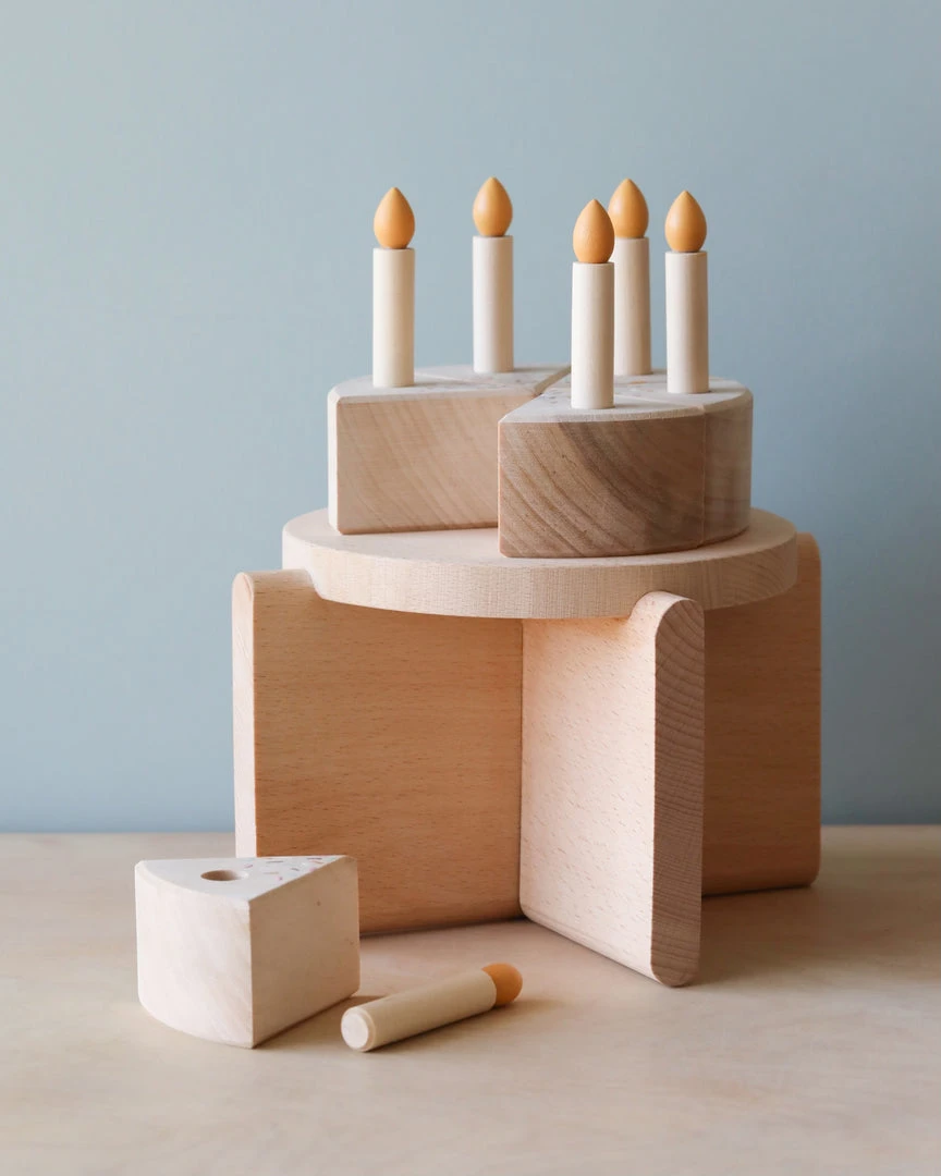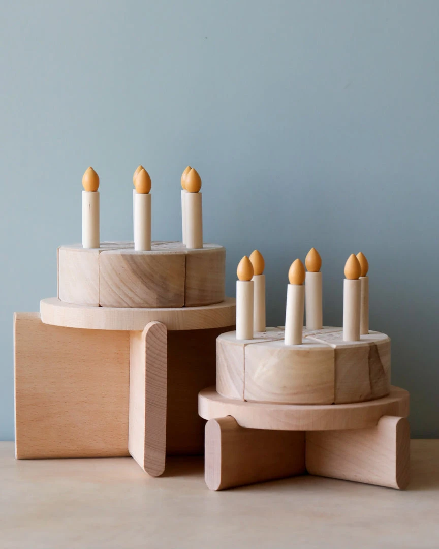 Handmade from birchwood and painted with non-toxic paint. Please note, each cake will have different knots and grains.Â