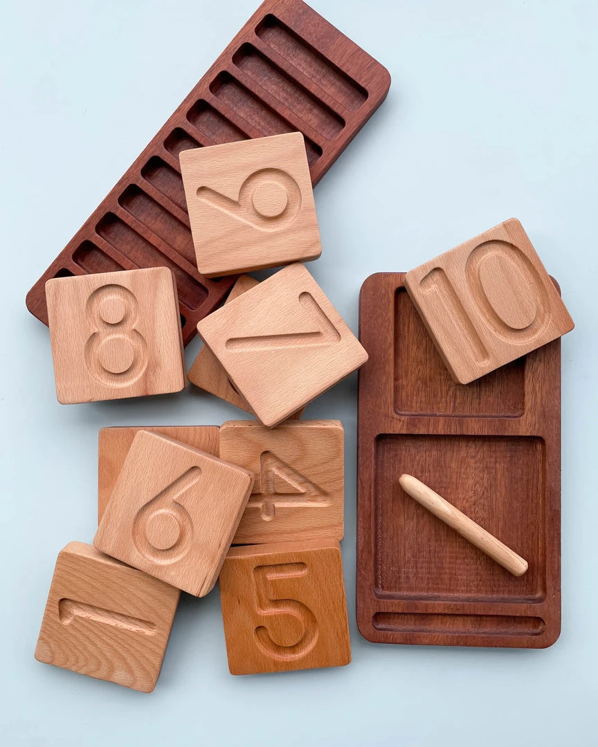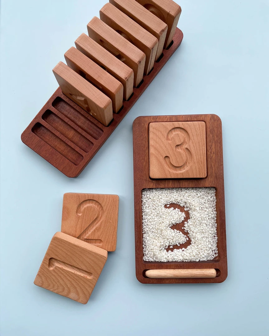 Our number tracing board is a fun and educational tool for your kindergartener or pre-schooler. Each set comes with 1-10 numbers that are stored neatly in a tray, a tracing board and a wooden pen. Fill the tracing board with sand, play dough or rice, and encourage your little one to trace the number above it.
