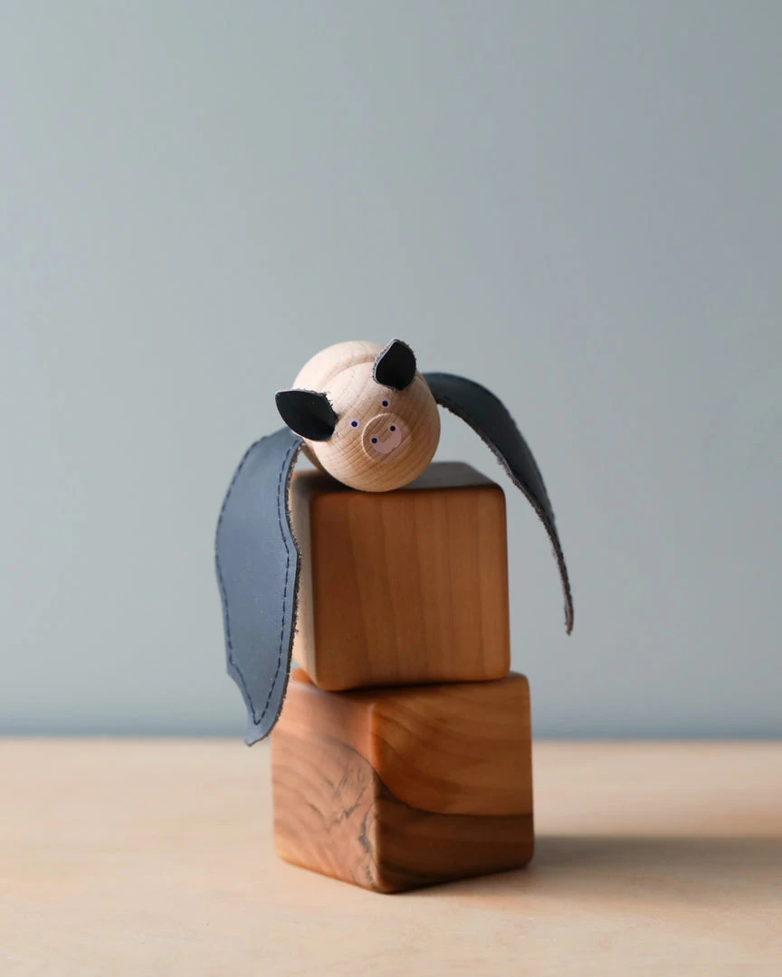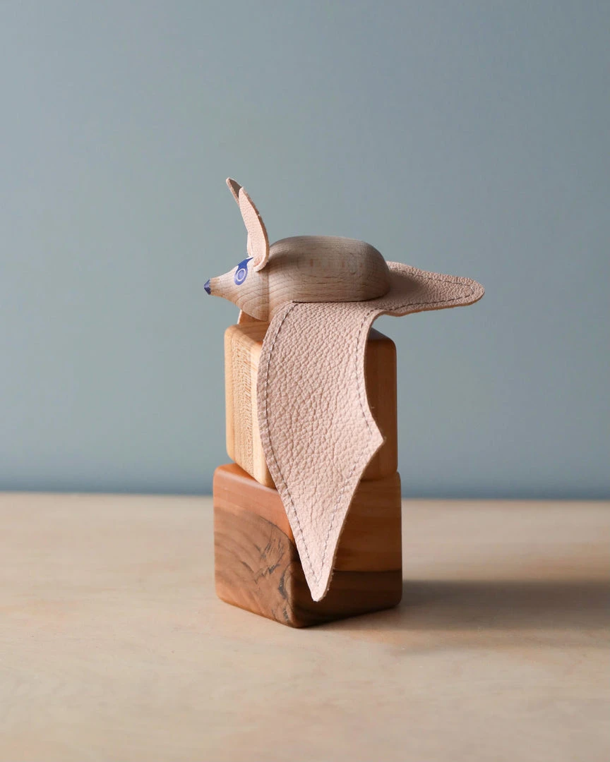 Size: approx. 6cm X 6cm Length of the wings: approx. 21cm (open wing type) Material: hand-painted beech wood and leather wings Comes in a hand-sewn, reusable canvas storage bag