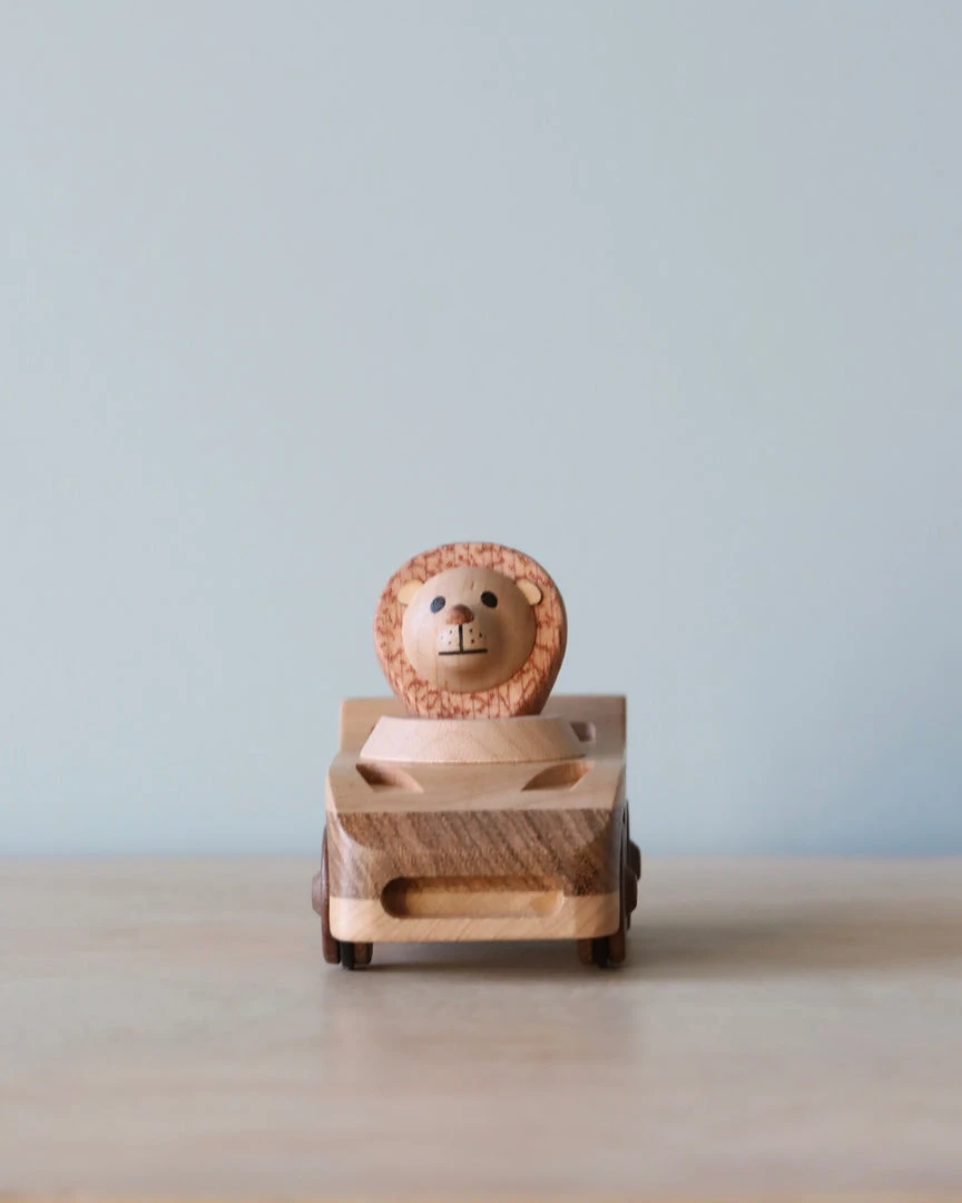 Made of solid wood with a pull back feature. The animal is not removable. Available in three different designs.