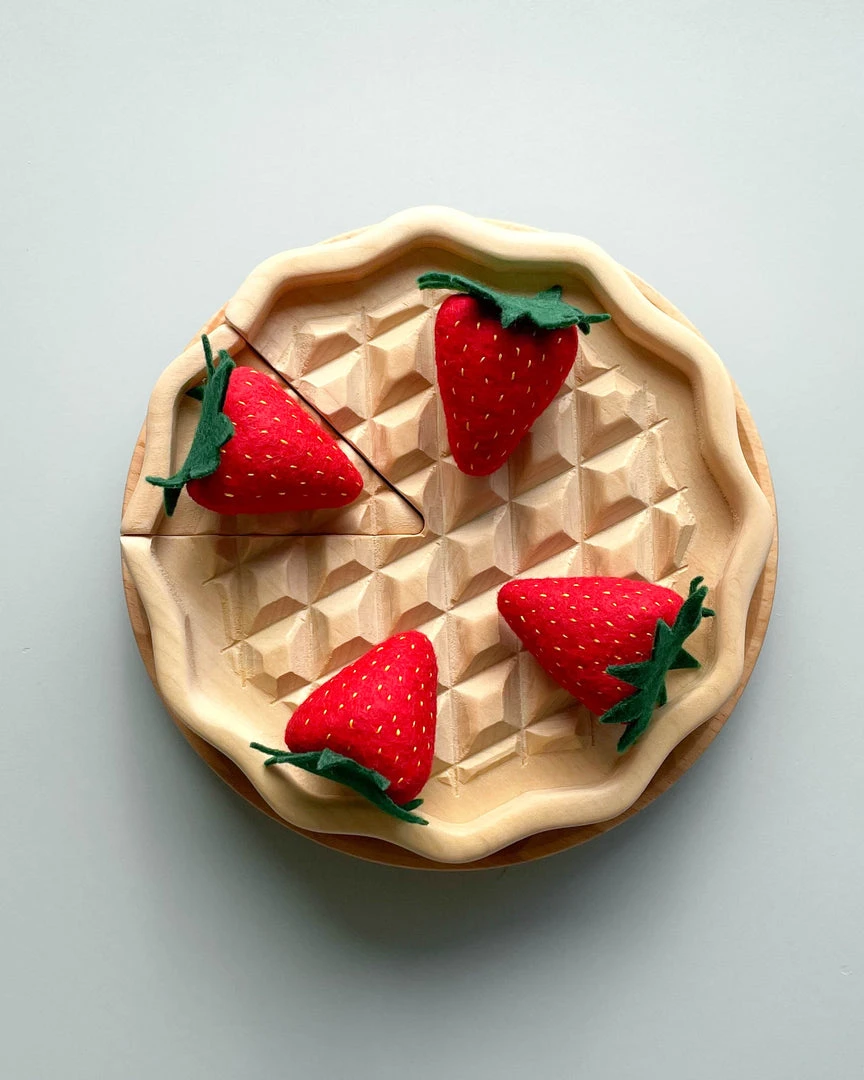 This set includes a pretend wooden pie (with a removable slice), four felt strawberries and a wooden platter.Â