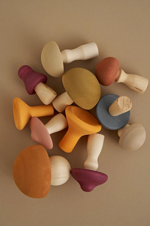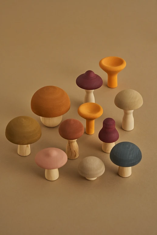 Contains 11 mushrooms, handmade in Russia by Raduga Grez, from lime wood wit non-toxic paint.Â
