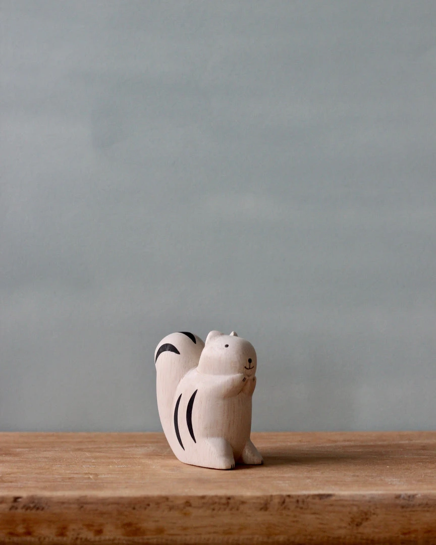 Each animal is hand carved from a soft light wood and then hand-painted with the sweetest expressions and patterns. Due to their handcrafted nature, each animal is slightly different.
