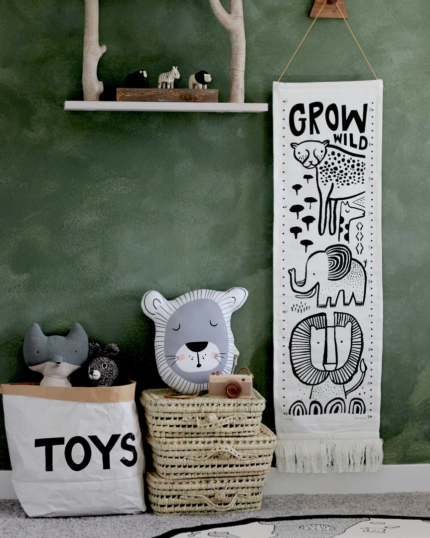 This growth chart features sweet animal faces that smile as your little one grows. Ethically and sustainably made in India using screen printing on organic cotton canvas, finished with a leather hanging cord and stylish fringe end. Comes in a special keepsake bag with a place for your child’s name and birth date.